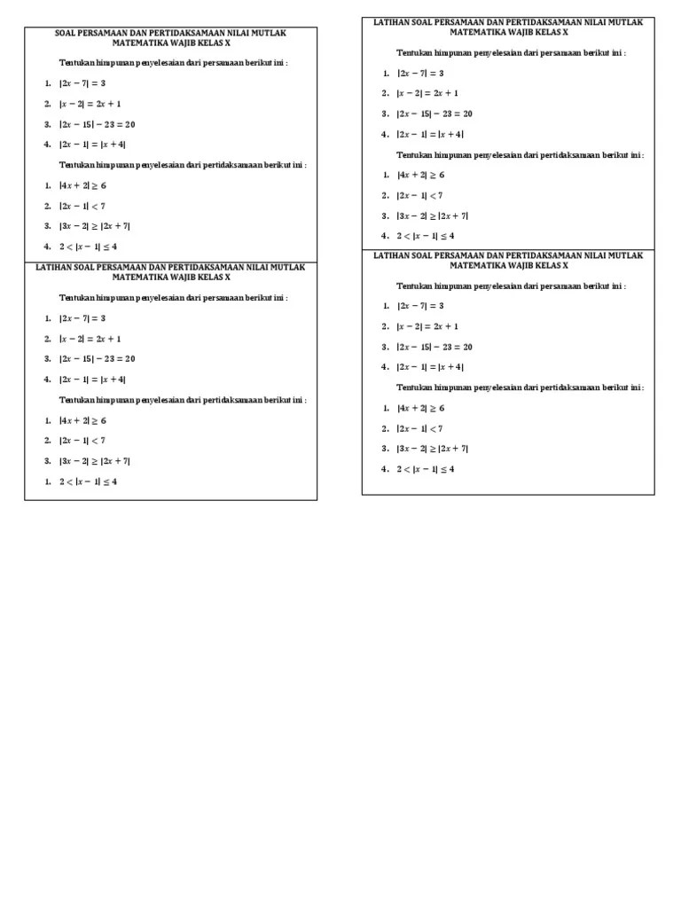 Persamaan Nilai Mutlak Kelas 10 - Contoh Soal Pembagian Pertidaksamaan Nilai Mutlak Linear Satu Variabel / Bandung bab 1 persamaan dan pertidaksamaan linear satu variabel yang memuat nilai mutlak sma darul .